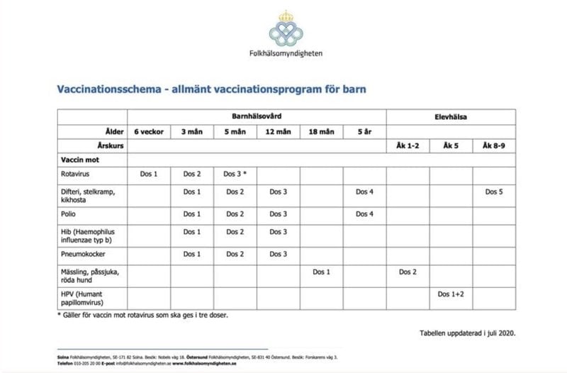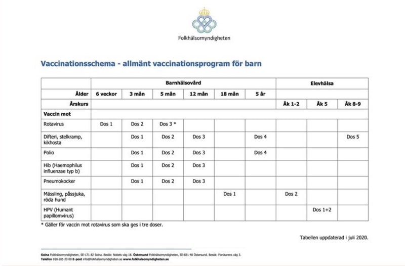 Redan när bebisen är sex veckor gammal så ska de ta den första sprutan i allmänna vaccinationsprogrammet. Folkhälsomyndigheten har ett omfattande schema som visar när barn ska ta vilka sprutor, och i vilken ålder man behöver fylla på doserna.