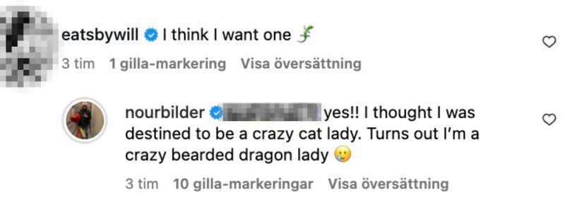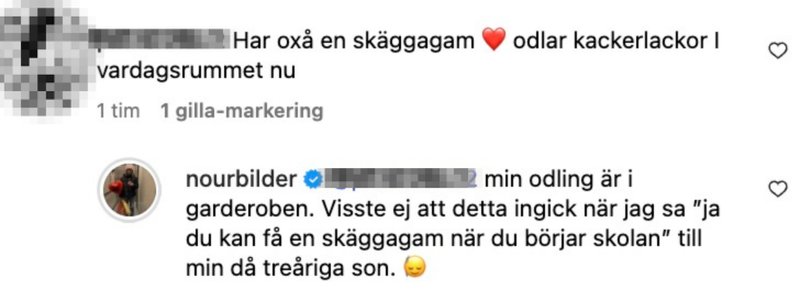 I kommentarsfältet berättar Nour att hon gav ödlan i present till sin son, Sami som hon har tillsammans med Henrik Schyffert, när han nyligen började skolan.