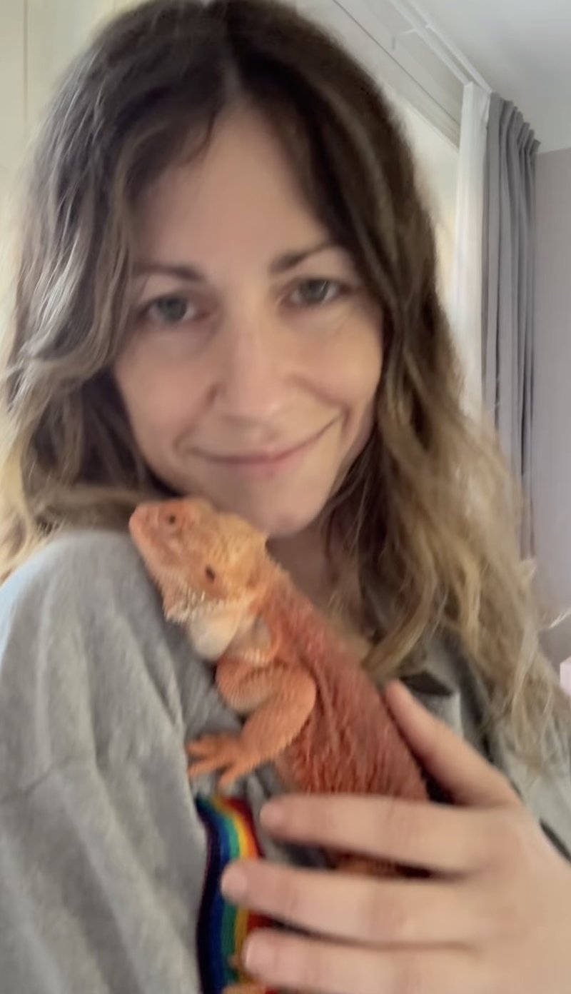 I en video visar hon upp när hon står och myser med en ödla, en skäggagam.