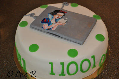 Ljusa bottnar, limemousse, jordgubbsmousse, spacklad med grädde, täckt med sp, dekorerad med sp och svart marsipan