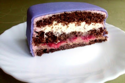 Ljusa bottnar, rårörda hallon med marsanpulver, dumle ganache, spacklad med grädde, täckt med sp, dekorerad med sp och sockerkulor