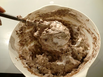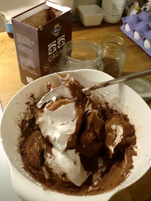 Så här gjorde jag: Jag gjorde en vanlig banta-chokladmousse på 3 stora äggvitor och 3 matskedar socker som jag vispade HÅRT SOM SATAN det är viktigt. Sedan hällde jag på 4 matskedar kakao och smekte ner den i äggvitan. Det är viktigt att man ömsom hackar, ömsom smeker in kakaon.
