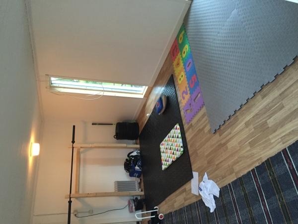 Det var tidigare en vedbod rummet är 5,7x3,5 m, det finns golvvärme men den är aldrig igångsatt så jag måste lufta slingan innan den går att använda. Pullupräcket sitter på väggen utanför dörren, racket ska målas någon dag, det fungerar över förväntan och är riktigt stumt. Hittar jag bara en rodd är jag nöjd
