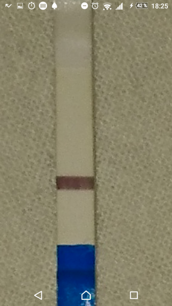 Jag är alldeles alldeles skakig. Jag vet inte vad jag ska tro. Vi har försökt bli gravida i 1 år och det har inte tagit sig någon gång. Denna gång har jag känt mig lite annorlunda, har haft som mensvärk redan några dagar efter äl som hållit i sig samt mycket flytningar och väldigt känslig och nära till gråt. Är på bim eller bim-1. Brukar sällan testa men fick ett infall nu och då har jag redan kissat två gånger imorse så på tredje kisset fick jag detta. Fick ingen toppenbild men strecket kom direkt, är ljusrosa och är kvar 5 minuter senare.