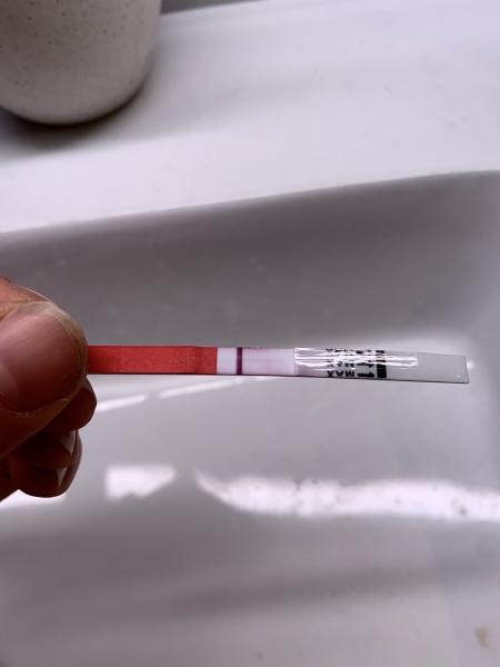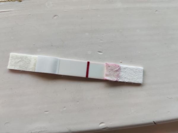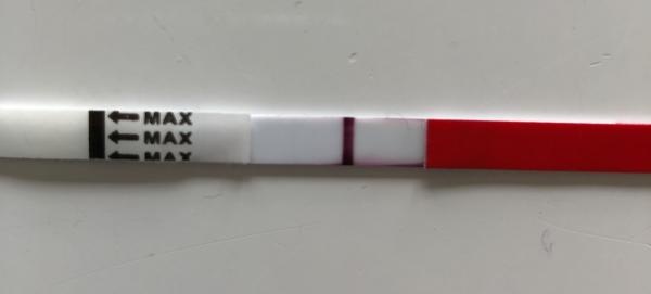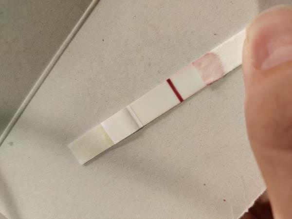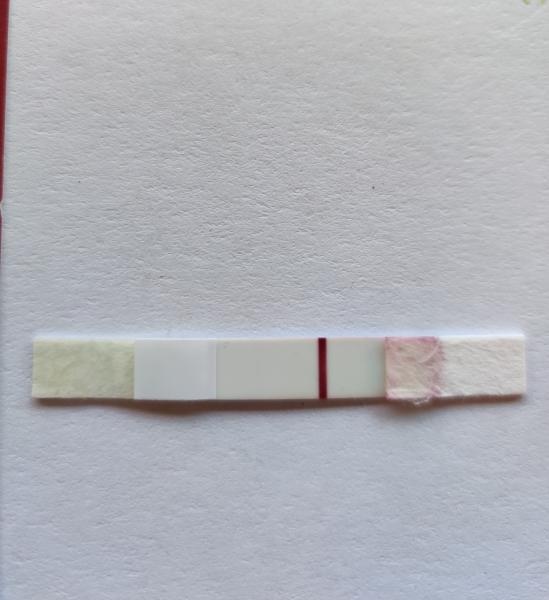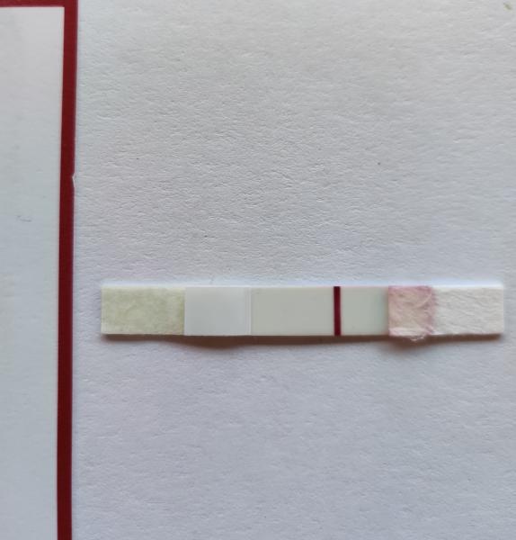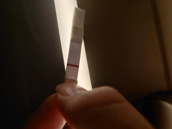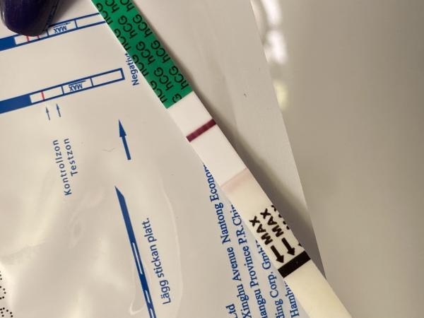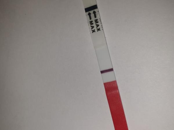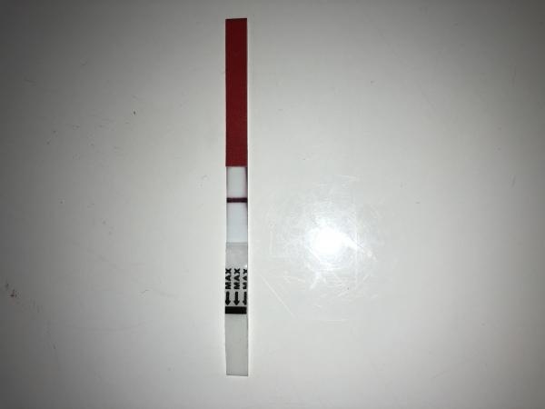 Känner mig som största tönten. Tog ett test idag, ÄL+6, egentligen bara för att se om jag kunde köpa en sista dosa snus (skulle aldrig snusa efter ett plus). Tog för givet att det var lugnt och att det skulle bli ett helt blankt, supernegativt test. Men till min förvåning så blev det en svag svag skugga till streck. Knappt synbart på bilden, men inte alls blankt som det jag tog igår (testberoende deluxe).