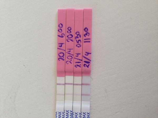 Nytt ÄL test och man kan urskilja ett ytterst ytterst svagt streck. Kanske ÄL är på väg trots allt bara lite senare. Annars skulle jag haft ÄL idag.