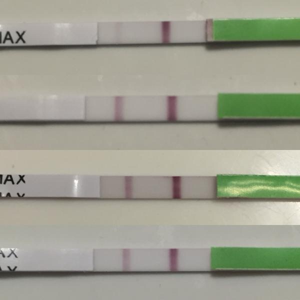 Lite svårt att tyda då det är lite mörkt. Men jag skulle säga att det är åt det positiva hållet i mitten. Dock olika färgskala på olika test. Egentligen ska båda strecken ha samma färg. Samma mörka rosa. Vilket dina inte har.