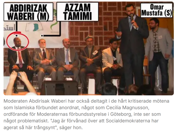 Samtidigt representerade Moderaternas Abdirisak Waberi, med dokumenterade kopplingar till det Muslimska brödraskapet i Europa, partiet i Sveriges riksdag i fyra hela år utan att det väckte motsvarande reaktioner från den Moderata partiledningen.
