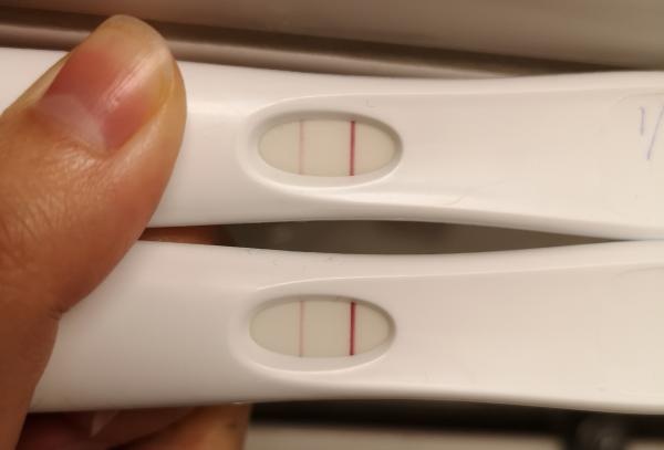 Jag tycker du har bra streck! Heja strecket! Jag trodde också att strecket skulle öka varje dag men det kunde ta tre dagar för det att öka i styrka. Här nedan är mina från rd 9 och rd 10 med en fet blastis. Det gröna är graviditetskollen och det röda RFSU. Det röda ökade inte i styrka igen förrän rd 13. Testade som en galning när jag insett att jag fått streck :)