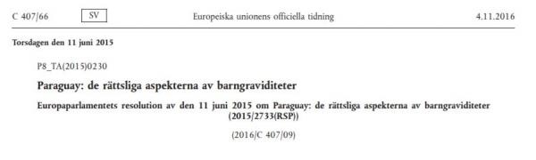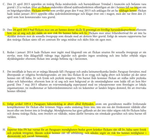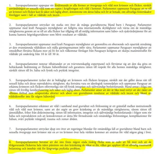 "Europaparlamentet tycker det är beklagligt att kvinnors och flickors kroppar, särskilt när det gäller deras rätt till sexuell hälsa och deras reproduktiva rättigheter, ska fortsätta vara en ideologisk tummelplats och uppmanar Paraguay att erkänna kvinnors och flickors oförytterliga rätt till fysisk integritet och självständigt beslutsfattande, bland annat i fråga om rätten till frivillig familjeplanering och säker och laglig abort. Parlamentet anser att det är lika med tortyr att det råder ett allmänt förbud mot terapeutiska aborter och abort om graviditeten resulterat av våldtäkt och incest och likaså att våldtäktsoffer inte får någon hälsovård"