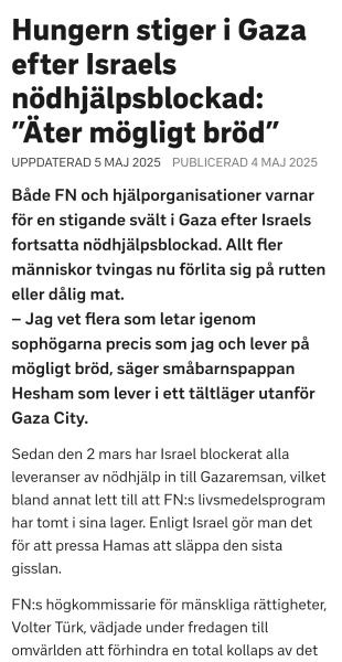 Ok. Jag vet att du vill hylla precis allt Israel ( och Trump) gör, men...nedanstående artiklar, som du själv länkade till, är i alla fall korrekta och bevisar att det råder svält i Gaza pga Israels blockad. Du kan inte förneka det. Annars får du gärna berätta för oss vilken av nedanstående artiklar bevisar motsatsen och varför: