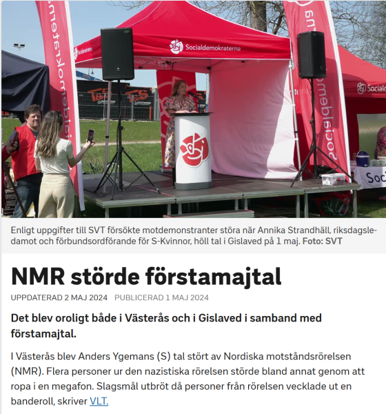 Som sagt, är helt ointresserad av denna diskussion om svenskar i NMR. Tack för mig.Du bryr dig inte om att Sverigedemokraterna under 90-talet upprepade gånger störde den allmänna ordningen, ofta med våldsamma inslag. Du har inte heller några invändningar när nazister i NMR år efter år saboterar 1 maj-demonstrationer och skrämmer deltagare.