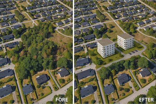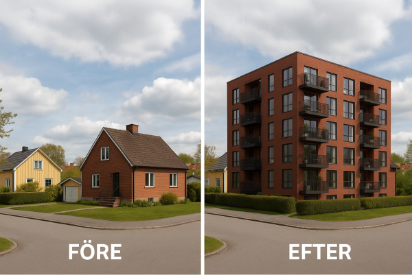 För det fjärde har det förstås noll betydelse för sakfrågan om hyreshuset hamnar på någons avstyckade tomt eller på tomten bredvid.