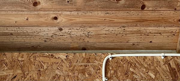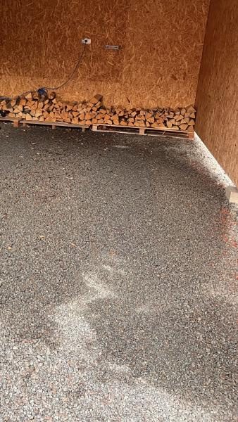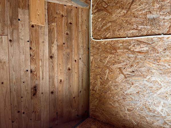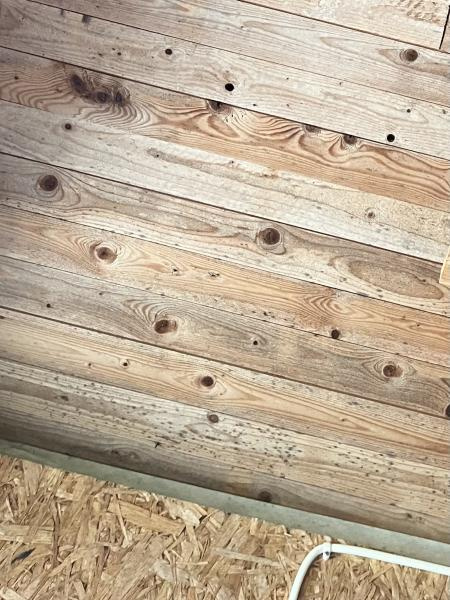 Taket är obehandlat trä, väggarna är obehandlade OSB-skivor. Väggarna verkar stå på någon form av "träplint/stötta" (direkt på asfalt) (de kommer säkert med tiden "ruttna"). Välkommen till att bli husägare... Saker kommer över tid att behövas fixas, så är det bara.