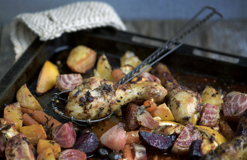 Så gör du: Skär potatis och morötter i bitar, lägg på plåt. Lägg kycklingen ovanpå, ringla över olja och krydda. Rosta i ugn på 200°C i 30–35 min.