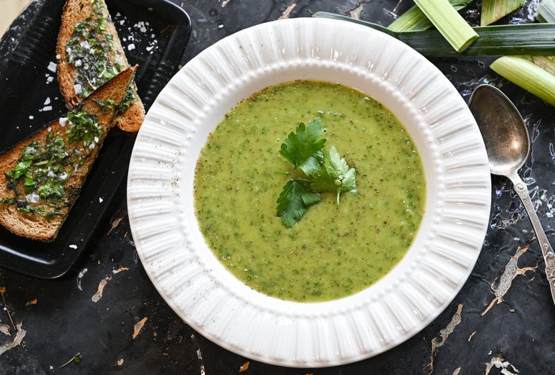 Så gör du: Fräs purjolöken i smör, tillsätt tärnad potatis och buljong. Koka tills potatisen är mjuk. Mixa soppan slät, rör i grädde, smaka av med salt och peppar.
