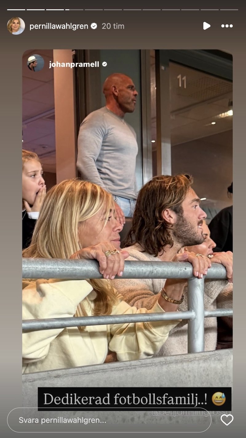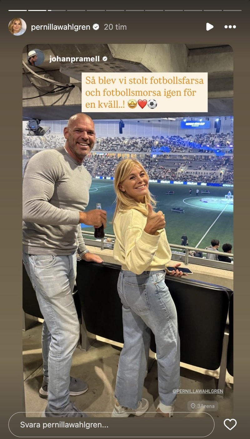 På Instagram beskriver Pernilla Wahlgren sin stolthet över sin sons första fotbollsmatch på 3 Arena.