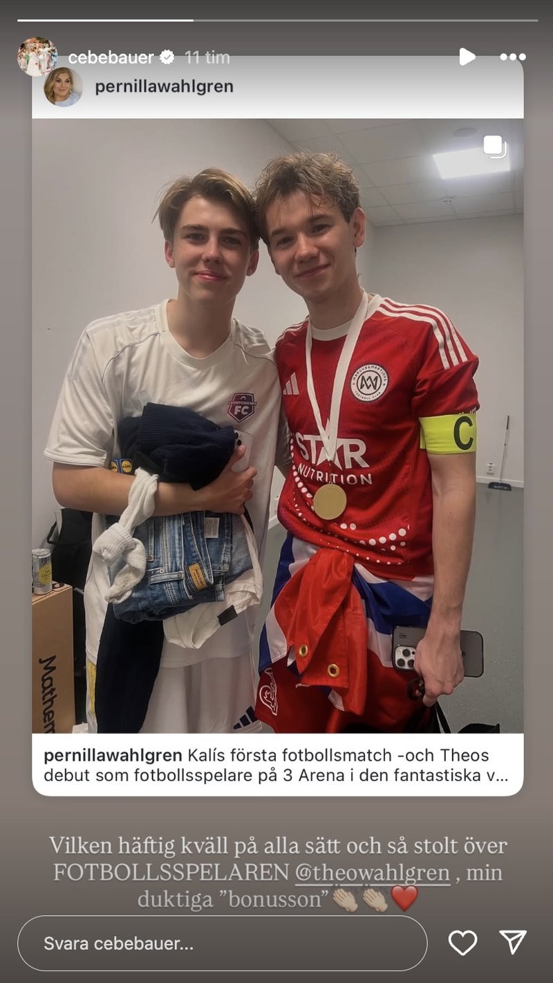 "Vilken häftig kväll på alla sätt och så stolt över FOTBOLLSSPELAREN Theo Wahlgren, min duktiga 'bonusson'"